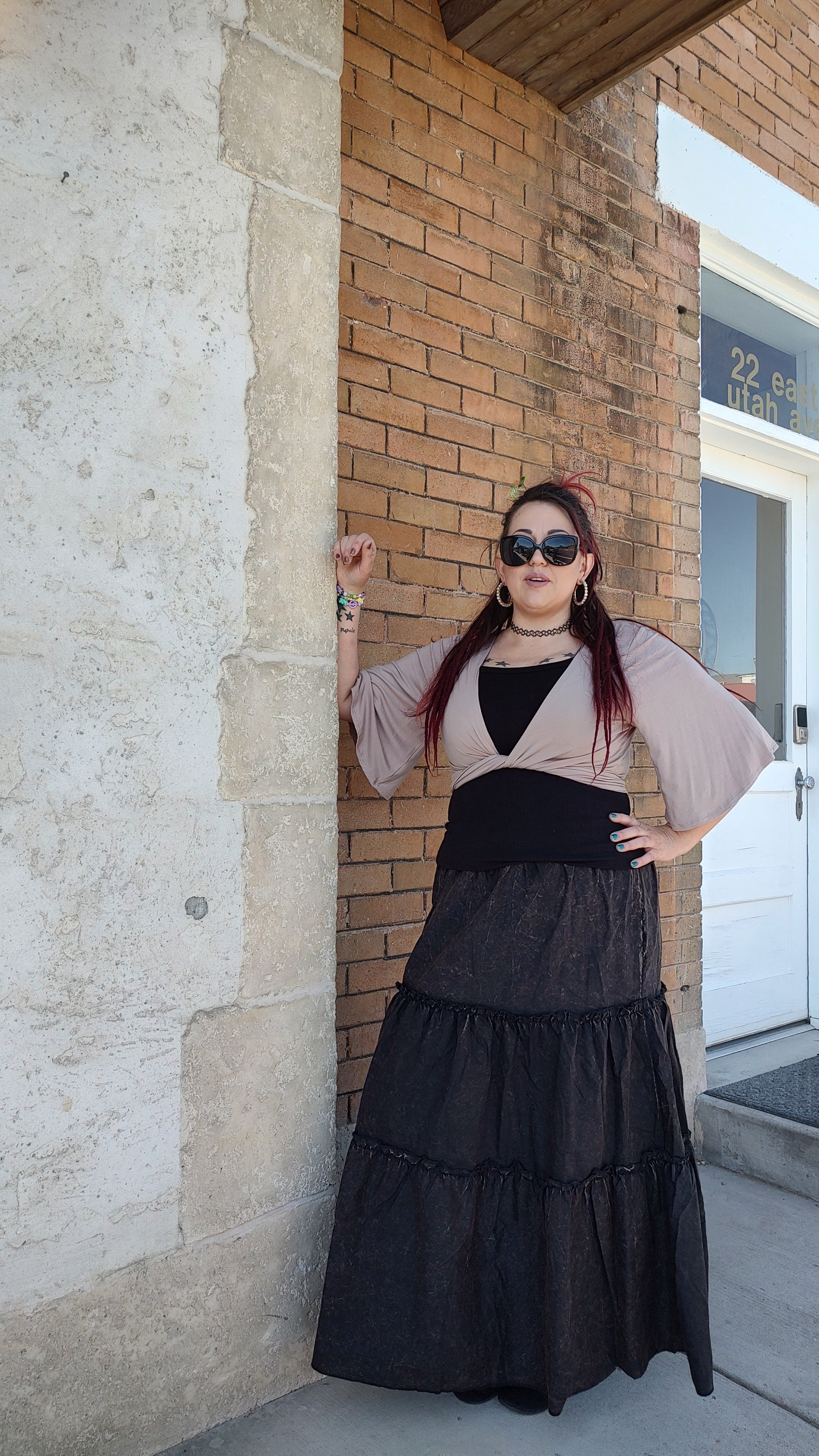 This boho-chic maxi skirt features a tiered ruffle design and an adjustable drawstring waist for a perfect fit. Made from 100% cotton with an acid wash finish, it offers a laid-back, breezy look that's perfect for any casual outing!
