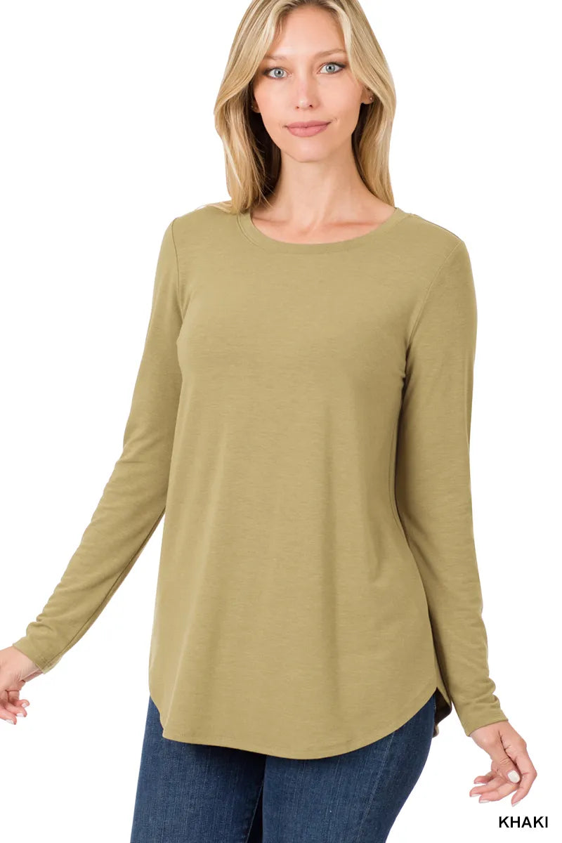 Elevate your everyday look with this versatile long sleeve top, featuring a classic round neck and curved hem for a flattering silhouette. Crafted from premium-quality fabric, with a relaxed fit, this top is a wardrobe essential you’ll reach for time and time again. Perfect for layering or wearing on its own!